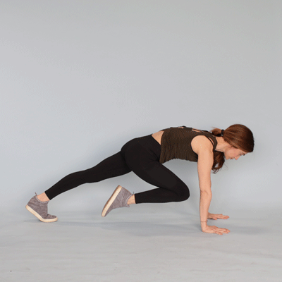 - Using your abdominals, bend your right knee in toward your chest, then step it back into the plank position.