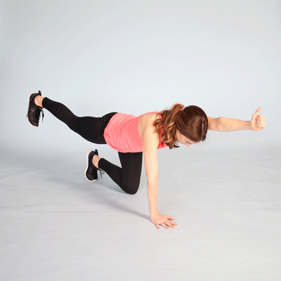 - Tighten your core. Lift and straighten your right leg to hip level. Simultaneously lift and extend your left arm to shoulder level, palm down. Hold a neutral spine without allowing your back to arch as you extend your arm and leg.