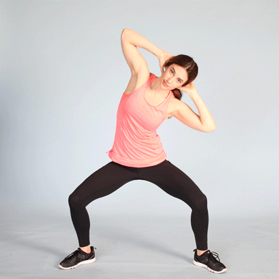 - Bend your torso to the side, moving your right elbow toward your right thigh. Repeat on the left side.